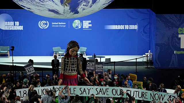 Little Amal, a giant puppet of a 10-year-old Syrian refugee appeared at the COP26 yesterday. The 3.5-metre puppet completed ‘The Walk’, a four-month travelling festival of art and hope over 8,000 km from the Syrian border to Manchester. She was invited to Glasgow to open the Gender Day high-level event in the COP26 Blue Zone alongside young Samoan climate activist, Brianna Fruean to represent young women and girls from the global South on this world stage.